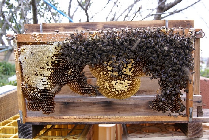 巣枠式のメリットを享受されてますね。これなら人工分蜂で楽々管理できますね。私も重箱を極めたら巣枠にも進出しようと思っています。