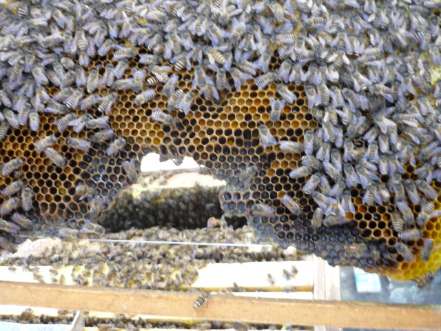 そこで、育児巣房の下の方の邪魔な巣板を齧り落して湾を作って暖房ができるようにする・・・