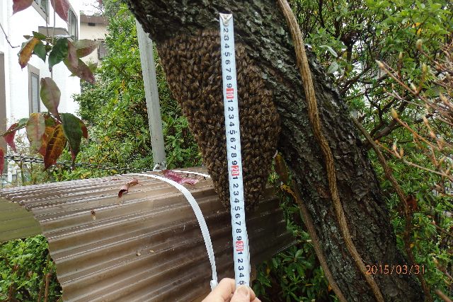 一昨昨日に続き蜂球第2号がお出ましです。第一号が出た巣箱の上方、枝垂れ梅の幹、3年前に私が蜂を飼うきっかけとなった蜂球が出来たゆかりの場所です。準備中に雨が降り出したので取り込みは明日午前中に延期しました。先日は「ドサッ落としこみ」で逃げられましたので、今回はjoeさんお勧めの捕虫網で優しくゆきます。