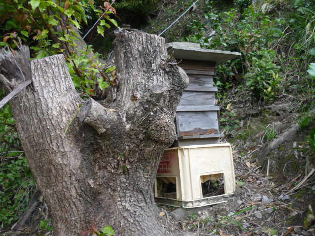 今日、種蜂の居ない友人の山に4箱の待ち箱セットしていますが、この中の1つに、3月17日にキン様を取り付けた箱を初めて見に行きました。