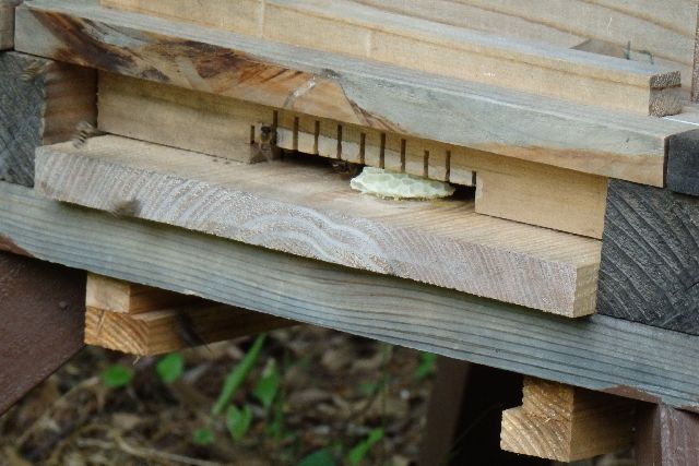 に近い事例ではないかと思われる証拠写真(添付)があります。昨年待ち箱巡回見回りに行ったときすでに入居していましたが、巣門の真中に小さな巣板が出来ており、かなりの長時間蜂球が巣門から動かなかったと推察されました。