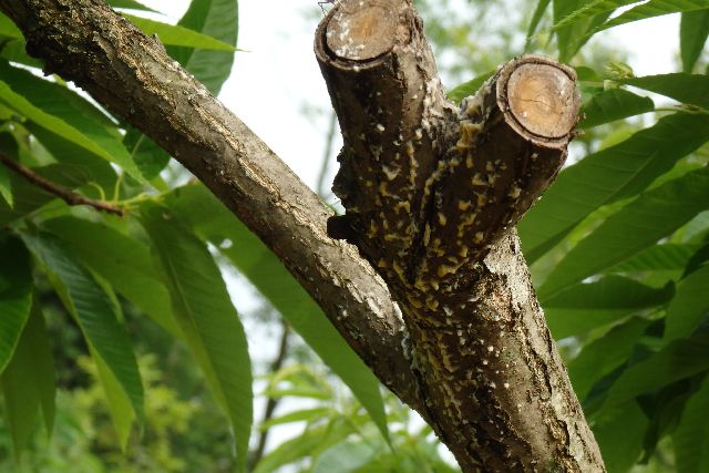 この現象ですが、蜜蝋を分泌して巣房造り担当中に分蜂に加わった働き蜂は、生理的に急には蜜蝋分泌を止められないらしいです。やり場のない蜜蝋を捨てた跡です。授乳をやめてもお乳が止まらないママさんに似ています。参考に、昨年洋蜂球が数日間留まった木の枝に付着した蜜蝋滓の写真添付します。