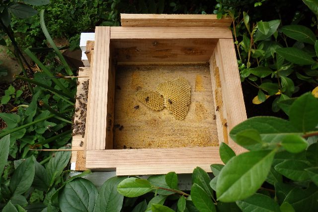 蜂をすくって上の巣箱に入れましたが、その際巣箱の下に営巣途中と思われるような蜜蝋がこびり付いていました。