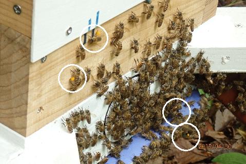 その中に花粉球を付けた蜂が数匹(写真○の中)見えます。これは、外勤から帰ってきて中に入りそびれた連中でしょうかね?