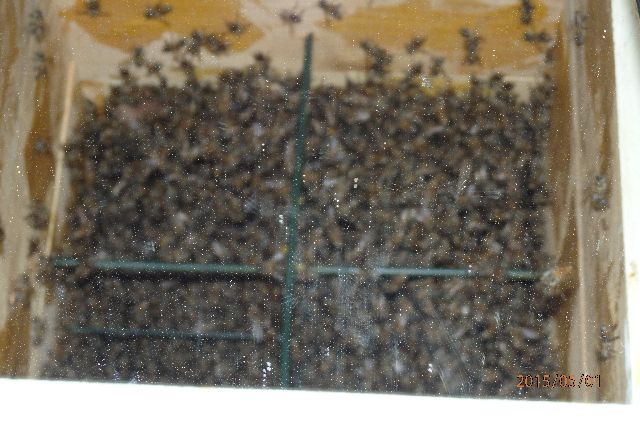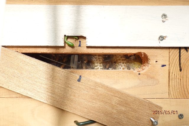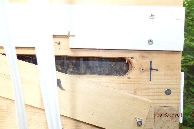 巣板が巣門側から奥に向かって3枚ほど、巣箱高さの真中ぐらいまで伸びていて、空間はすべて蜂で埋まっています。この巣箱の上下方向2か所の観察窓の写真添付します。