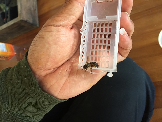 元の箱に戻したのでは逃げられる可能性が大なので近くの集蜂板に這わせました。