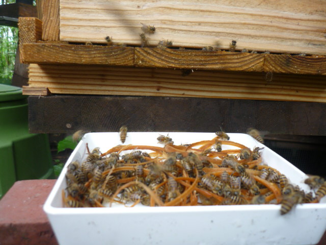 この晴れた4日の分蜂群にお礼の給餌をしています。