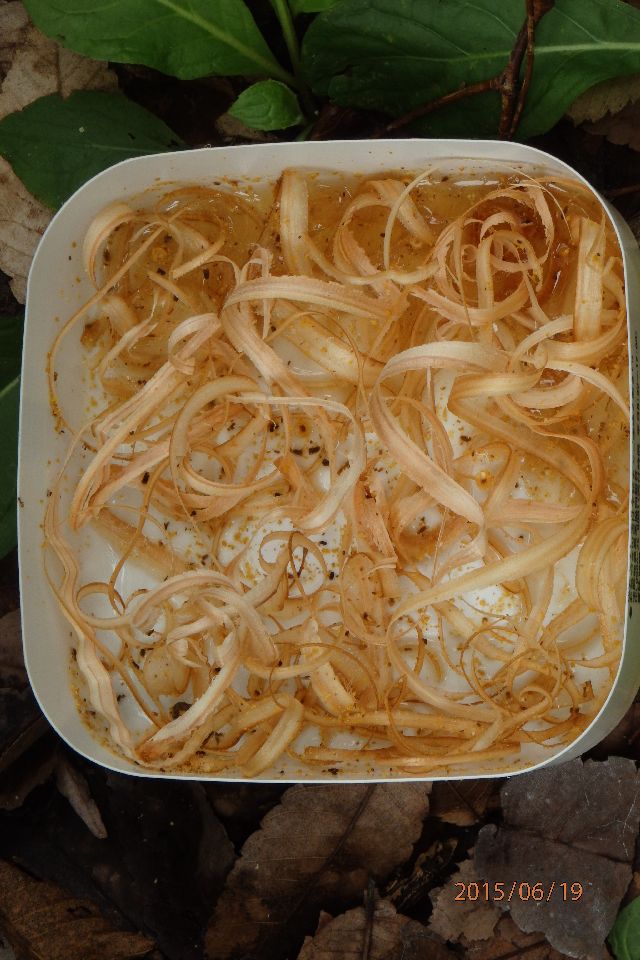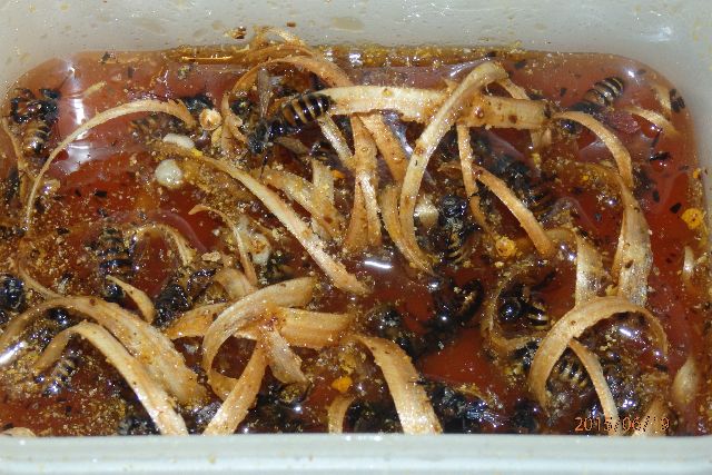 栄養ドリンク明日与えます。消滅群のスムシにやられた巣板蜜(食用にはちょっとと思うもの)は給餌用としてプールしています。児捨て群のも混じっているので、念のため、瓶詰め状態で20分蒸して徐冷して与えます。霧島さんのカンナ屑溺れ防止を採用して。