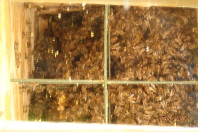 4)底から中を見たら巣板底がほとんど隠れるまでに蜂数が増加している。