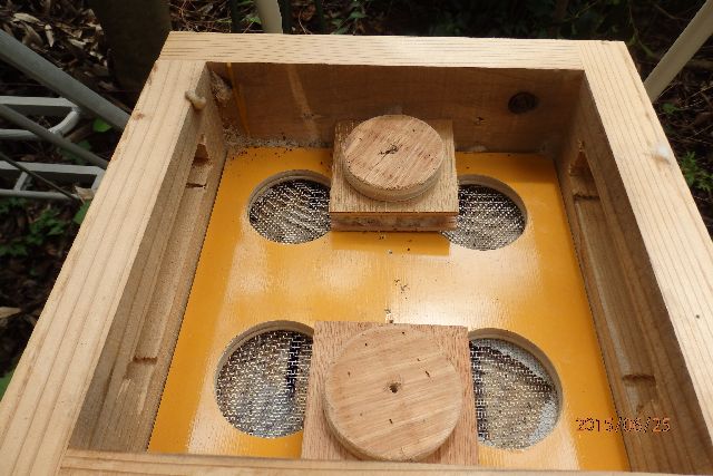 蒸れ対策実施しております。金網底板四隅に6mmの駒をかませて四方巣門とし、オオスズメの侵入防止と待ち伏せをしにくくしています。重箱天板は簀になっていてその上に換気(夏に使用、季節で開度可変)兼給餌室(冬に使用)を乗せて万全?を期しています。真夏は巣箱中心温度が金網底だけより数度下がります(比較測定結果)。