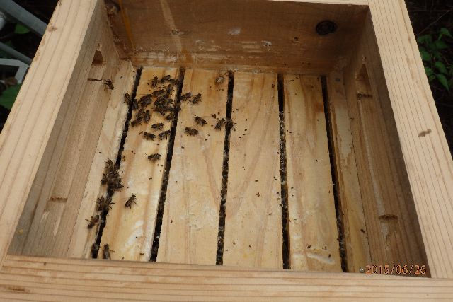 隅に一ケ所、10㎜くらいの空気抜き用の穴をあけて、そこから蜂も出入りさせます。