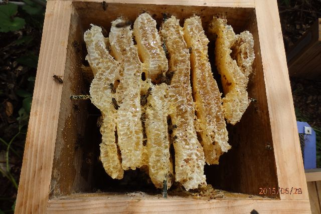 午後、残蜜回収しようと旧巣箱を見ると、巣箱内外に結構な数(捕獲しそこなった蜂数の数倍)の蜂が居ます。昨日逃去した後はもぬけのからでしたし、今朝の蜂球取り込みで逃がした蜂は数えるほどでした。底板直下の地面を歩いている連中は昨日から今日にかけて羽化した新生蜂、その他は他の群れからの残蜜窃盗団じゃないかと想像しています。この現象ご存知の方いらっしゃいますか?