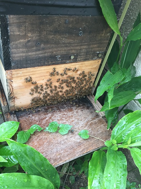 写真のように蜂が増えて巣箱の外にびっしりと付き始めます。