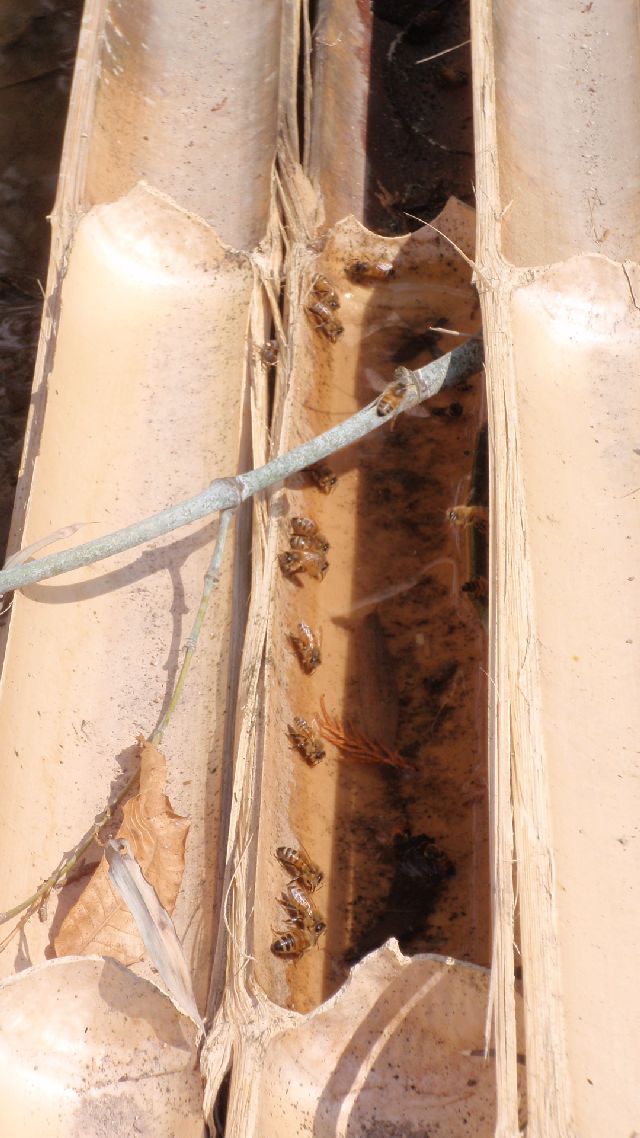 夏に水場に大挙現われるのは、上がりすぎた巣箱内温度を下げるための打ち水取水に間違いありません。巣内のどこにどういう風にまいているのかはまだ見た事ありませんが・・・。隣の業者洋蜂は、私の栗林に雨水だまりができると、ずら―っと並んで巣箱へピストン輸送しています(添付写真)。