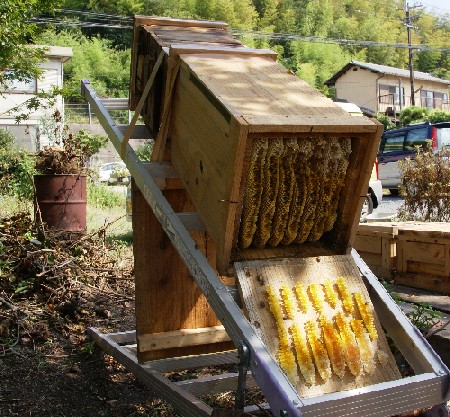 巣素摘出完了後、天蓋閉めてやると蜂は巣箱内に入って行きます。