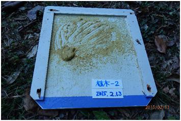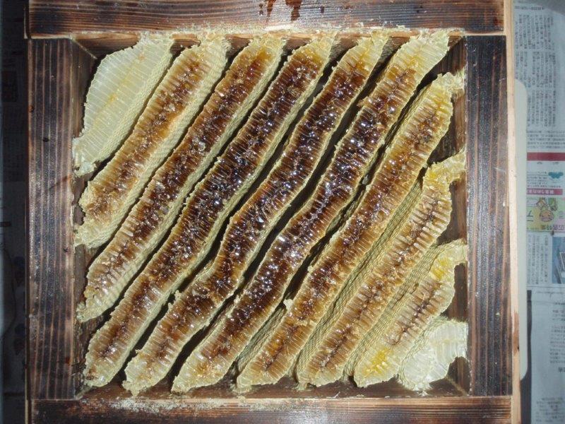 これに良く似ていると思われる写真を添付します。2月に点検した強群の底板上のものです。それまでの茶色の巣屑から黄色に一変しましたので新蜂誕生に関係していると直感しました。羽化した蜂が居た育児房の蓋の齧り屑(粉状)というのが私の見立てでした。どろっとしているのは結露で垂れた露のせいです。