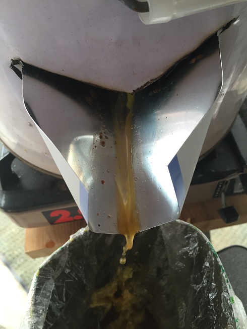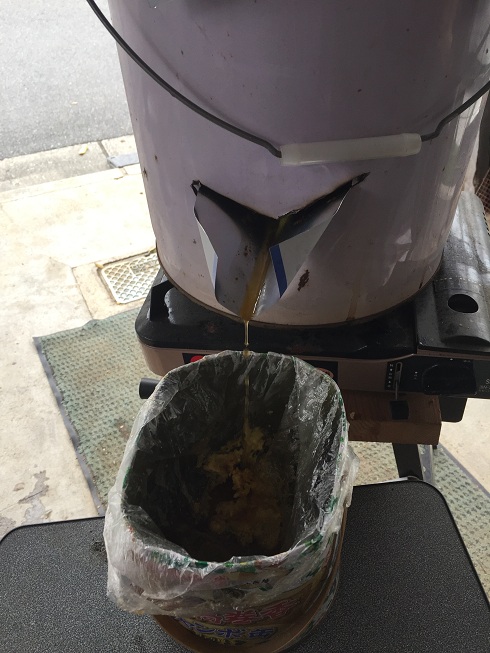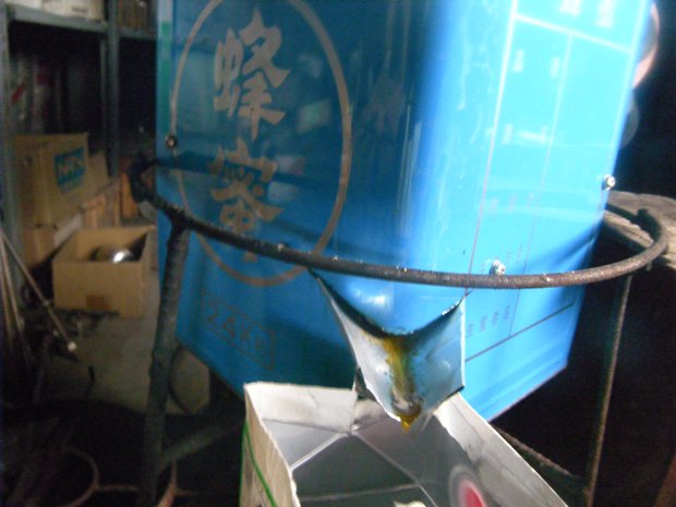 お湯が沸き、ペール缶の中は蒸気で温度が100度近くになりますので、80度前後で解ける蜜蝋が流れ落ちてきます。