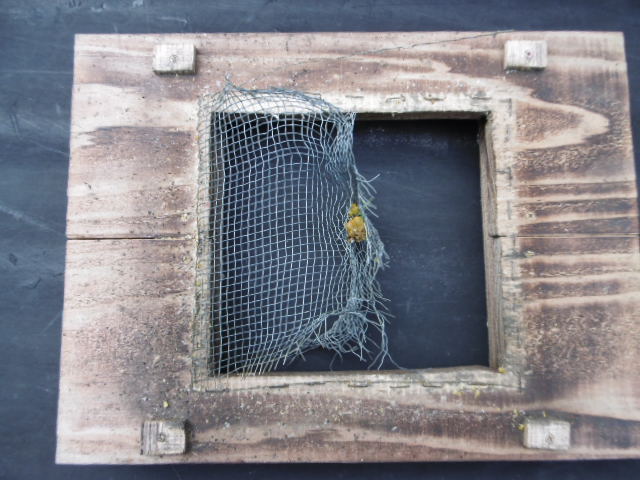 巣箱を持ち上げて見ると金網のメッシュがめちゃくちゃになっています。