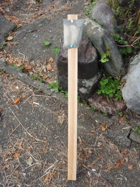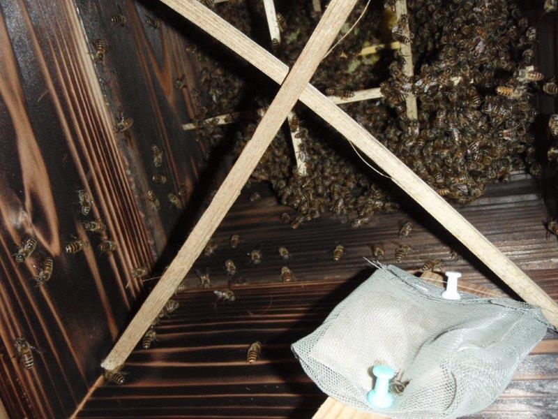 メントールを入れた網袋を細長い板の先に取り付けて、それを巣箱のなかに立て掛け、メントールをできるだけ上の方に持って行く・・・ なるほど、工夫されましたね。