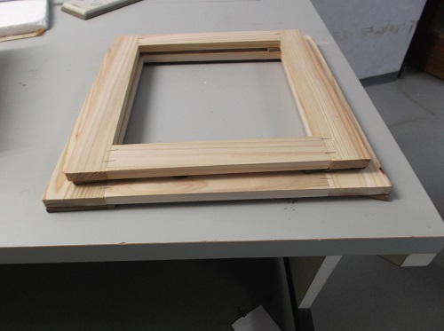 大きさが外枠で2センチずつはみ出す額縁を2枚作りそれぞれを5ミリの駒板を挟んで隙間を確保しました。