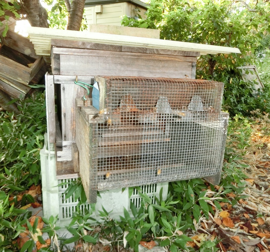 今朝見回ると昨夕異常なかったSSGが蜂に覆われています。案の定、オオスズメが2匹一本釣り攻撃中。網で一匹捕獲したのを囮にペタンコを設置。昼までに新たに3匹がくっつき、夕方にはSSG巣門も平穏を回復。この洋箱を狩り場にしていた数匹はすべて身柄確保したものと判断。