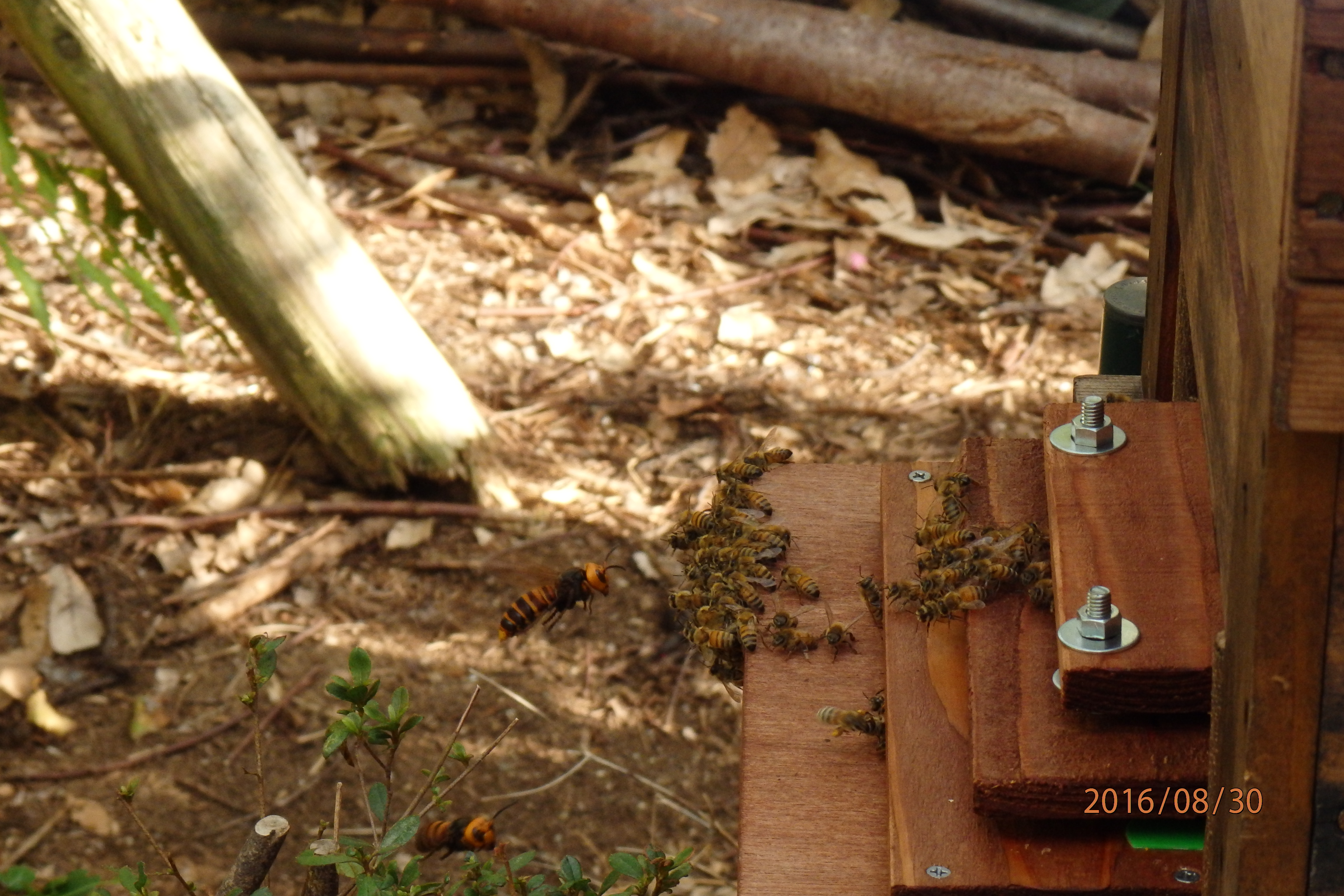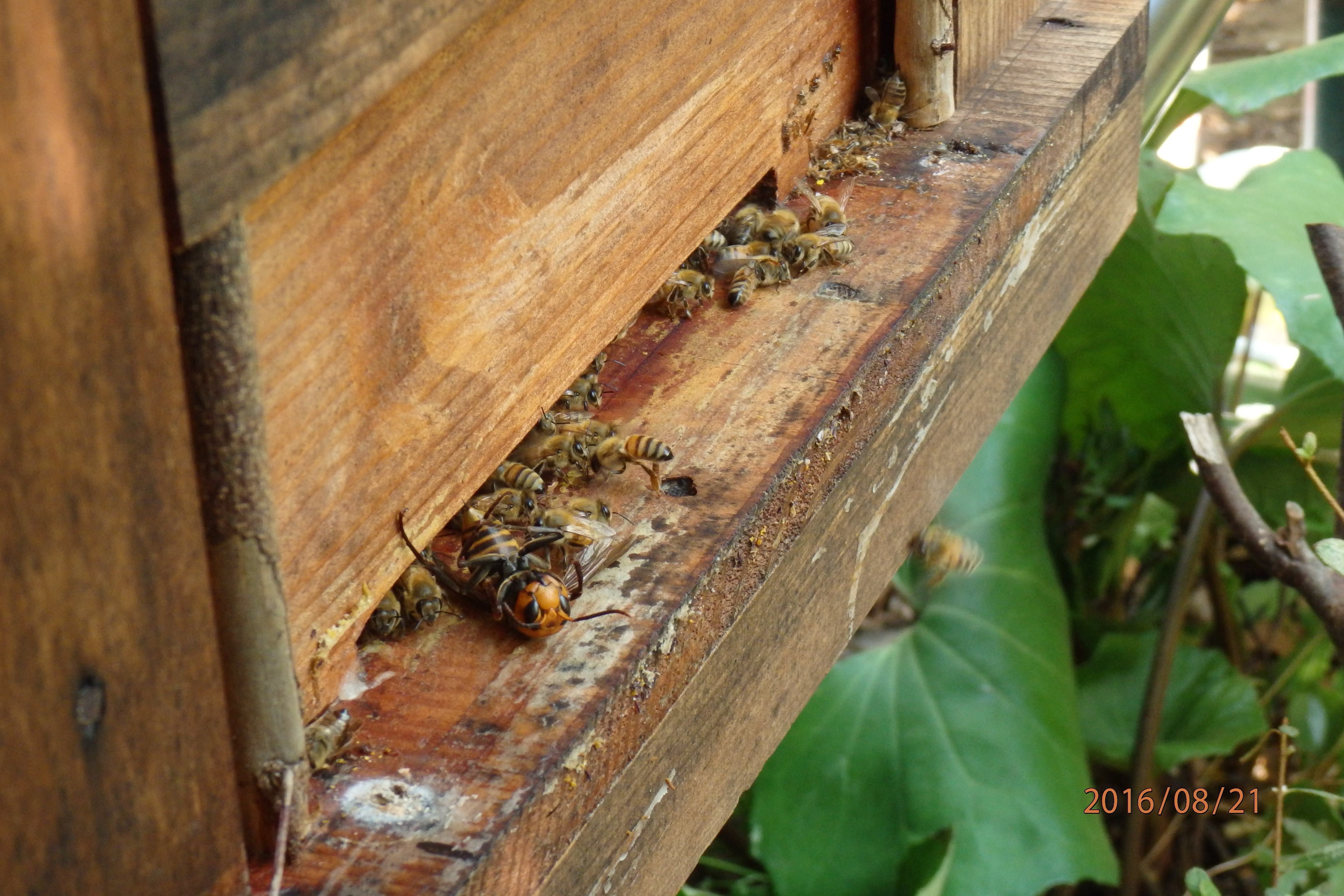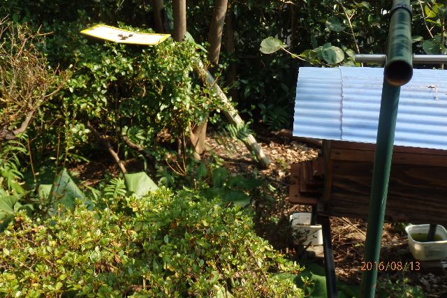この3日間平穏に見えましたが、今夕、第3波の攻撃がありました。幸い来襲初期に気がついたので、巣箱脇に立って迎撃。ペッタンコにくっついたやつ約15匹(更新ペッタンコがまたてんこ盛りです)、巣門前ホバリング中を撃墜したのが5匹。逃亡したのが数匹で日没となりました。何匹かは逃亡したのでそのうちに第4波攻撃隊が飛来するものと思われます。