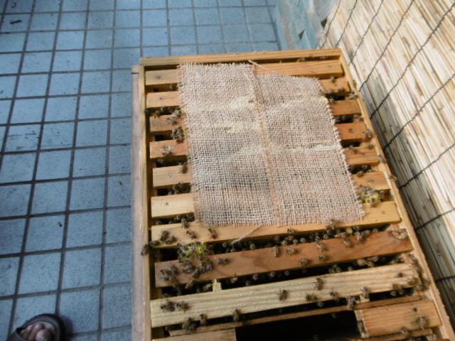 麻布の上にミツバチが上がれるようにするのは、スムシ対策です。