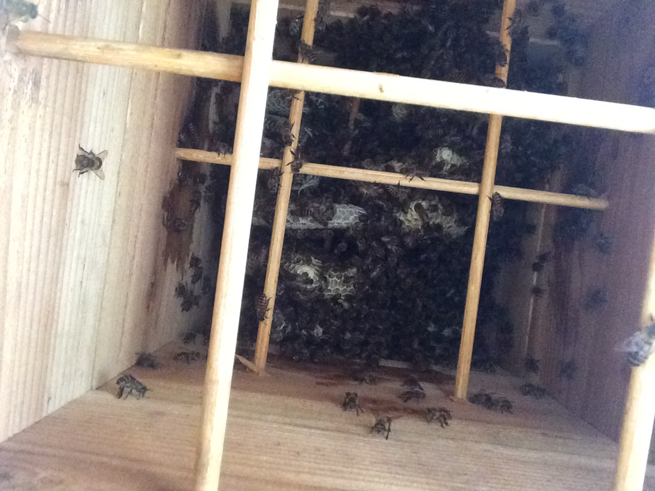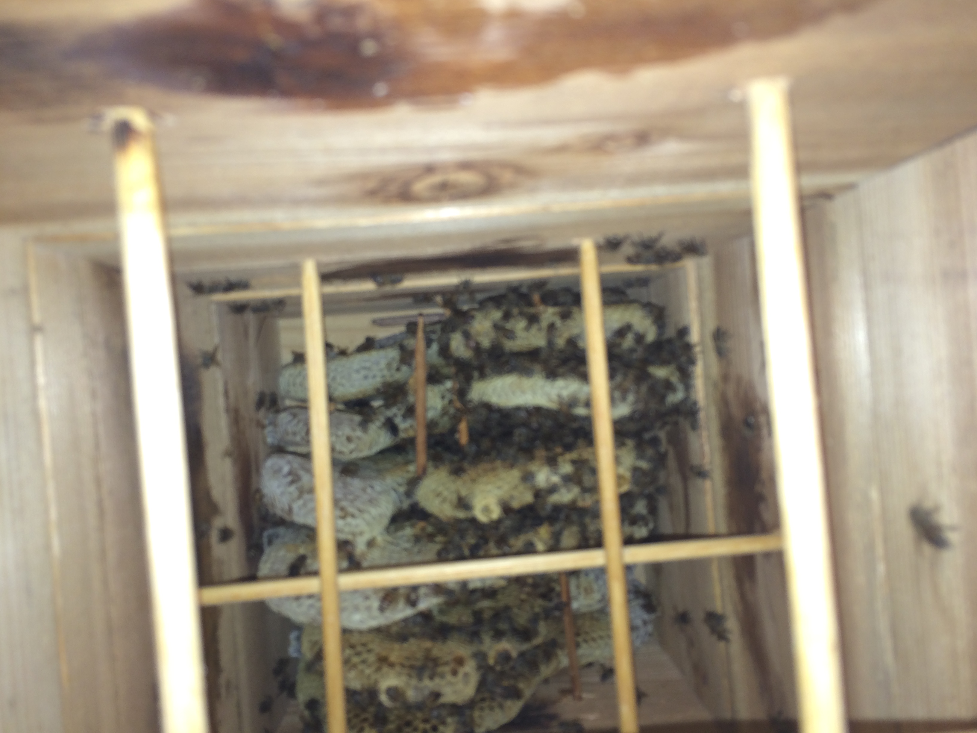 あれから1ヶ月、盛んに蜂達が出入りしてくれていますが、余り巣作りが進んでない様にも感じています。まだ1段目ぐらいでしょうか。