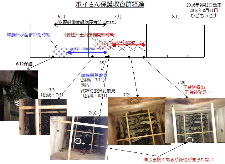 私も、皆さんにお示しいただいた経過を、時系列で整理(添付資料)してみました。そうすると、雄蜂の卵が産卵された時期、王台(新女王)の準備が始まった時期、保護した働き蜂が寿命でいなくなる時期などが推定できます。