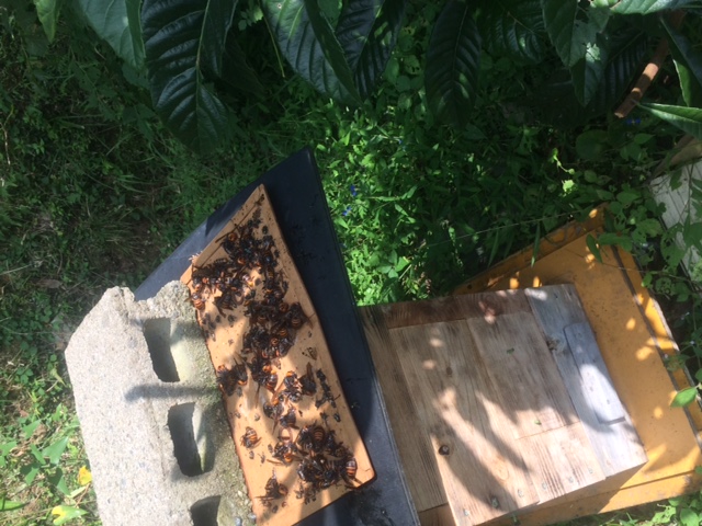我が家のハイブリッド群、10ミリのより穴より大すずめ蜂が侵入し30匹が底板に熱殺されていました。
