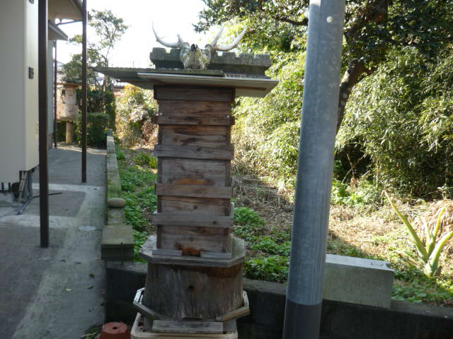 雨除けカバーの上に鹿の角が鎮座しています。