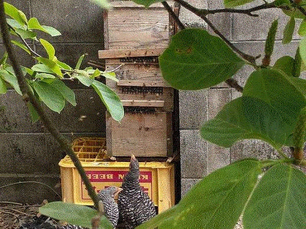 分蜂中の巣箱の前で待ち構えるニワトリ
