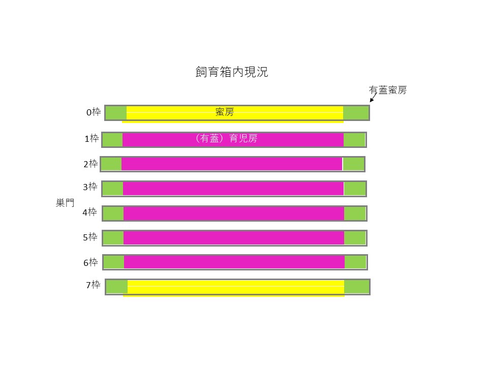 飼育箱内造成ほぼ完了し、内側6枚が育児、両外2枚が貯蜜として繰り返し使用モード入り。継箱ハイブリッド化改造完了次第継箱を載せます。
