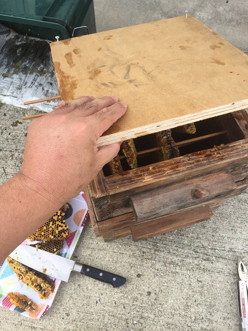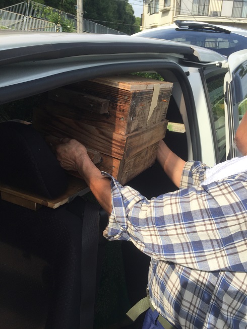 捕獲した蜂群を2階から下ろしてきたこの写真の撮影時刻が15:27でした。