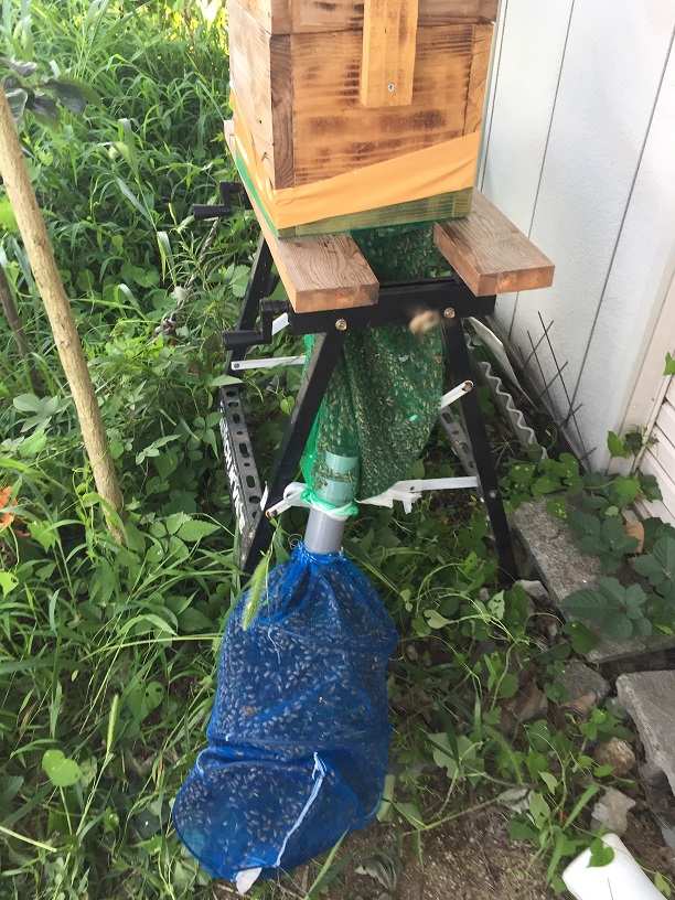 上の袋を揺さぶって蜂群を下の袋に落とします。
