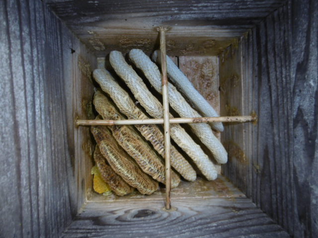 重箱の中の状況ですがやっと巣落ち防止棒のところ迄巣は伸びて巣落ちは有りません。