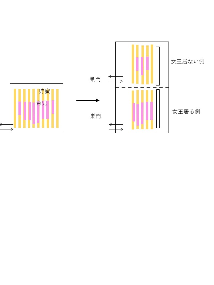 この様にすると上下に働き蜂が行き来して活発になる。