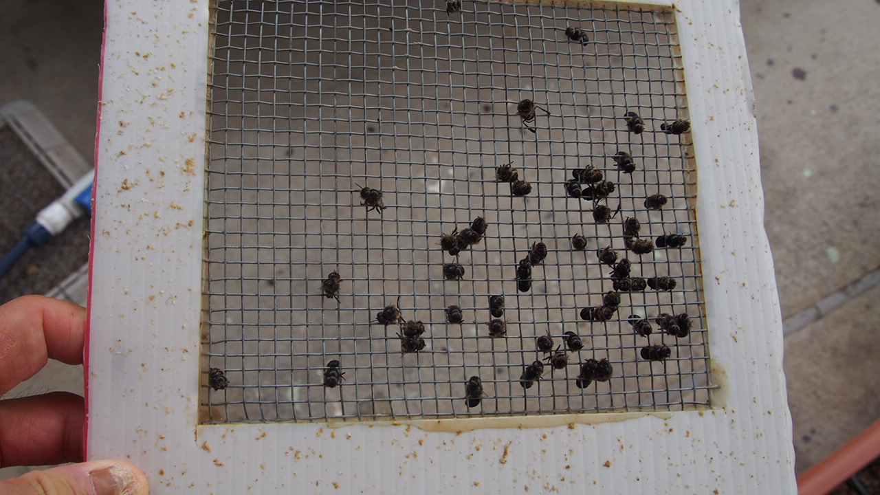 > 話変わりますが、夏分蜂阻止群巣底に付けた□4目の金網には雄蜂多数が挟まって干乾びてました。