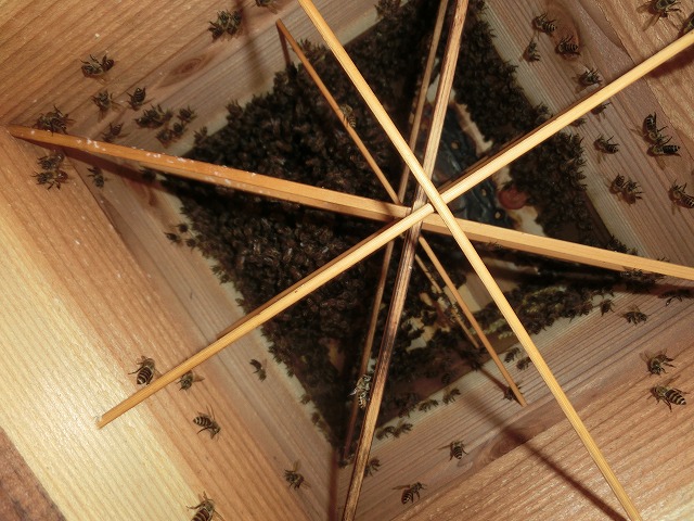 > 土、日の日中は巣箱~ネット内に洞群が出てきましたが、夜は木の中に入っていました。月曜日は巣箱の横隅下、火曜日は横隅中央、水曜日は天板へと少しずつ蜂球が移動したので、夜間に回収しました。