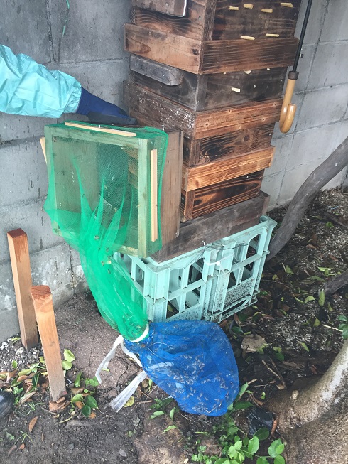 捕獲した青いタマネギネットを緑色のタマネギネットに連結して蜂を移動させて一晩置きました。